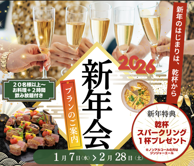 | お飲み物 | 【2時間飲み放題】 瓶ビール ウイスキー 焼酎(芋/麦) 梅酒 ノンアルコールビール ウーロン茶 オレンジジュース コーラ ジンジャーエール ●オプション① 赤白ワイン追加 +330円(税込) ●オプション② 生ビールサーバー追加 +550円(税込) ●ソフトドリンクのみの場合 -1,100円(税込) |