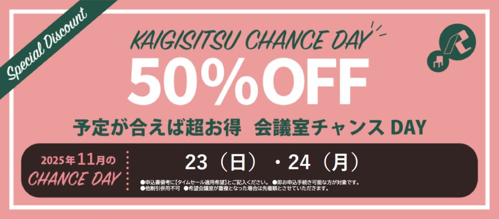 貸会議室のご利用料金が特別価格(通常料金より室料50%OFF)となるお得なタイムセールを実施いたします!