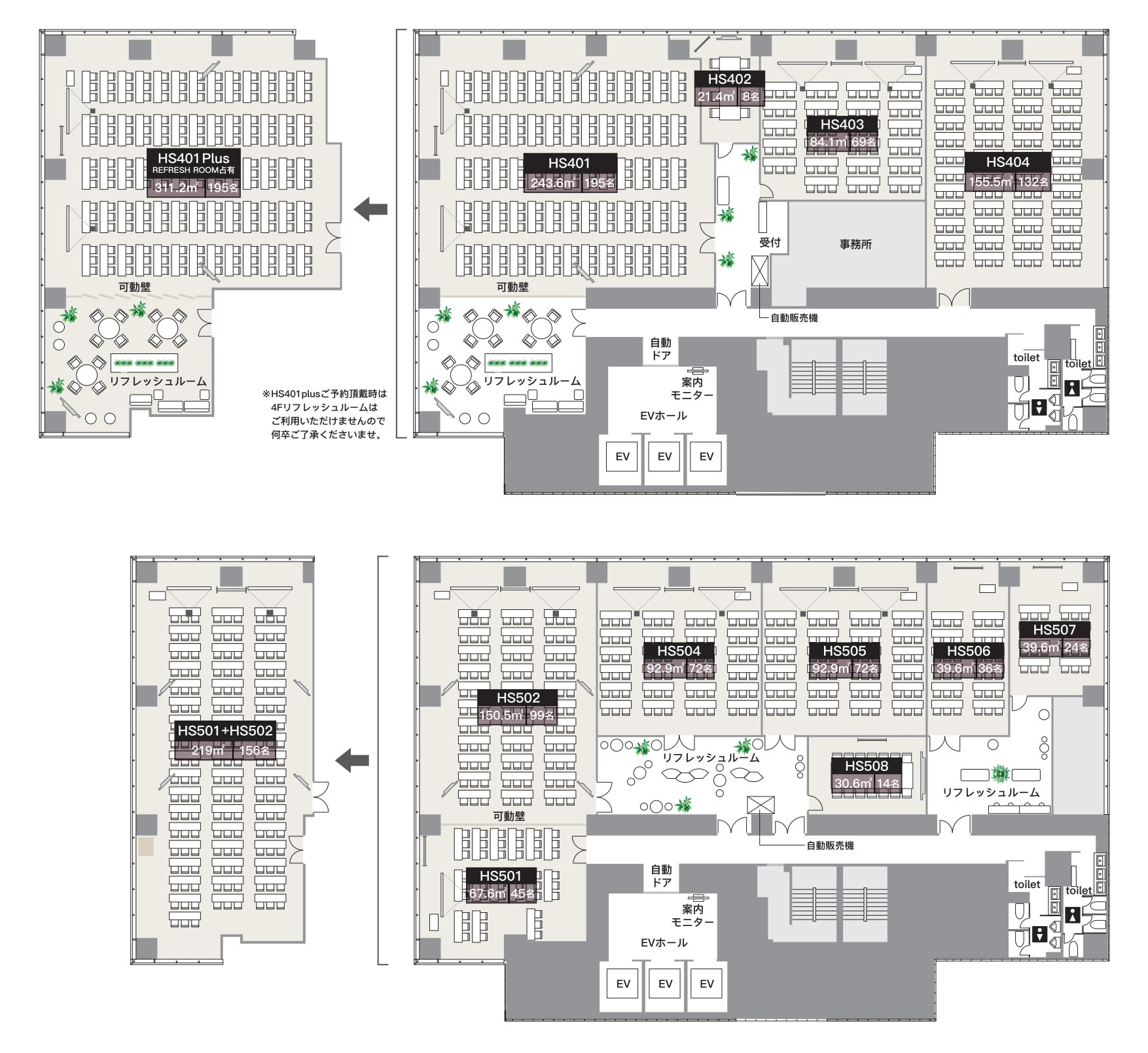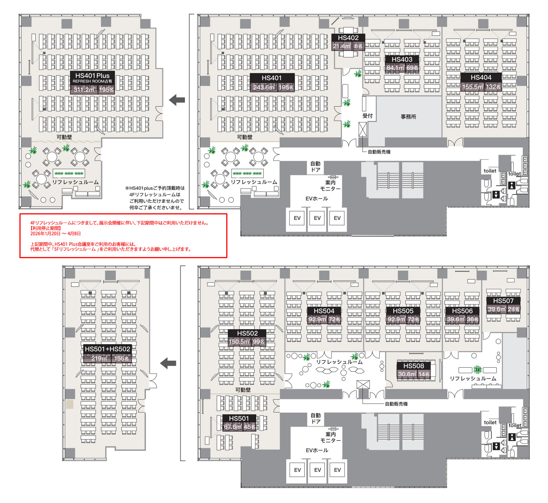 HS504・HS505・HS508前のリフレッシュルーム。 広々とした空間です。